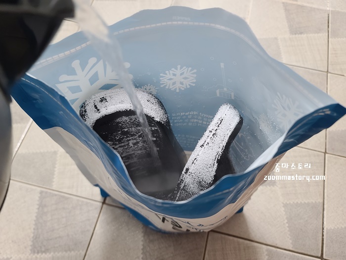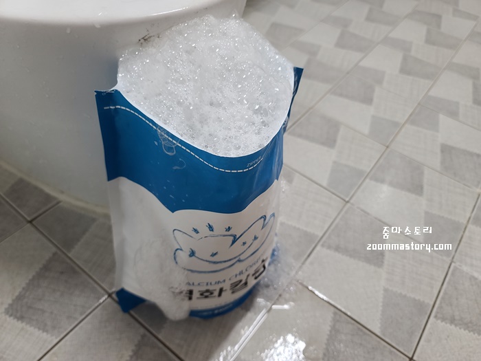 과탄산소다와 뜨거운 물이 만나면 바로 거품이 올라 오기 때문에 조금 큰 비닐봉지가 좋다. 난 집에 있던 재활용 비닐봉지를 사용했는데 조금 작아서 거품이 조금 꺼질때까지 기다렸다.