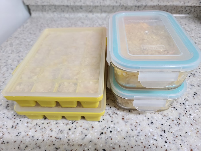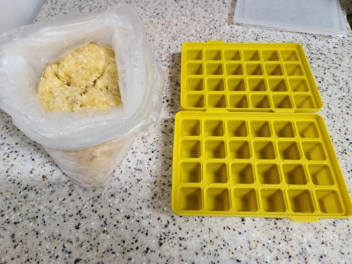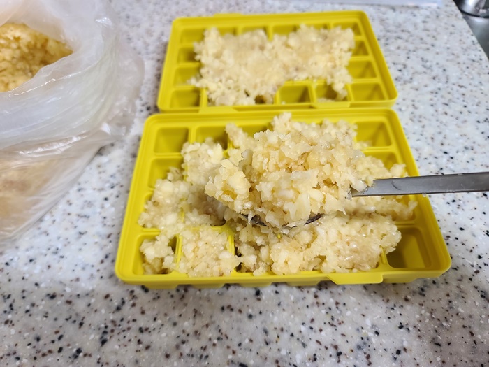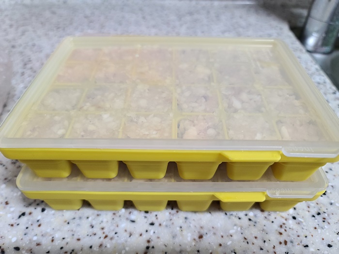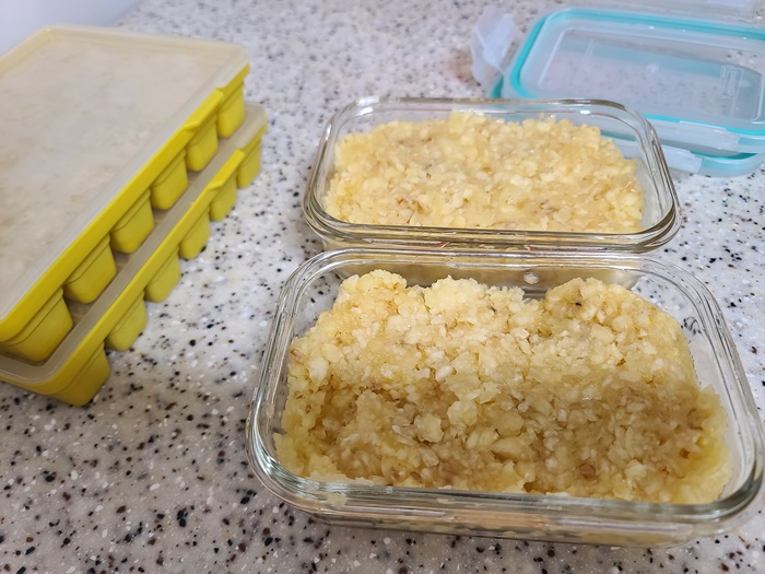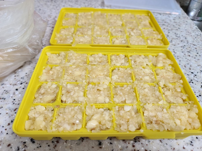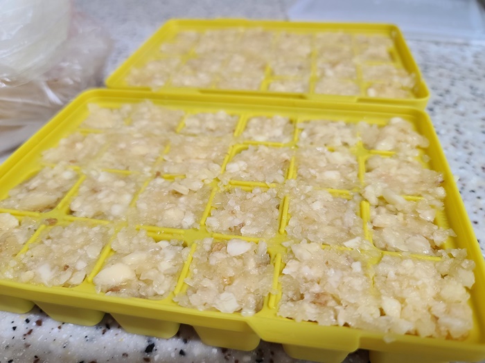 100% 마늘을 갈아서 사오자마자 바로 틀에 넣어서 냉동실에 보관한다. 틀도 냉동된 마늘이 잘 떨어지게 실리콘으로 된 것을 준비한다.