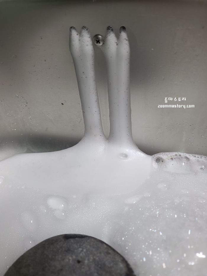 그 이유는 과탄산소다와 뜨거운 물이 만나면 거품이 마구마구 일어나면서 배수구 뚜껑을 아무리 꽉 닫아 놓아도 뚜껑이 열린다. 그렇기에 되도록이면 무거운 돌로 뚜껑을 막아 두면 싱크대 속 주변의 묵은때가 거품으로 인해 자연스럽게 지워지는 방식이다. 사실 싱크대 주변 물구멍을 우리는 자세히 청소하지 않는다. 물론 하기도 쉽지 않다. 그렇기에 싱크대 배수구 뚜껑을 덮어 과탄산소다 물이 자연스럽게 물구멍 사이의 묵은때를 불려 청소하면 편리하다.