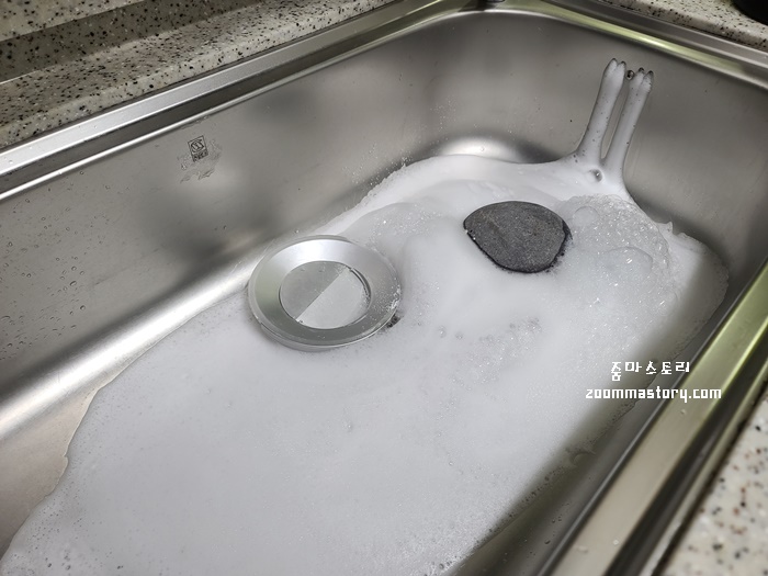 그 이유는 과탄산소다와 뜨거운 물이 만나면 거품이 마구마구 일어나면서 배수구 뚜껑을 아무리 꽉 닫아 놓아도 뚜껑이 열린다. 그렇기에 되도록이면 무거운 돌로 뚜껑을 막아 두면 싱크대 속 주변의 묵은때가 거품으로 인해 자연스럽게 지워지는 방식이다. 사실 싱크대 주변 물구멍을 우리는 자세히 청소하지 않는다. 물론 하기도 쉽지 않다. 그렇기에 싱크대 배수구 뚜껑을 덮어 과탄산소다 물이 자연스럽게 물구멍 사이의 묵은때를 불려 청소하면 편리하다.