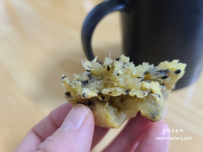 깨가 들어가서 씹을때마다 고소함이 배가 됩니다. 고구마의 달콤함과 과자같은 식감이 정말 입안에 감돌아요. 이거 완전 간식 도둑이 된답니다.