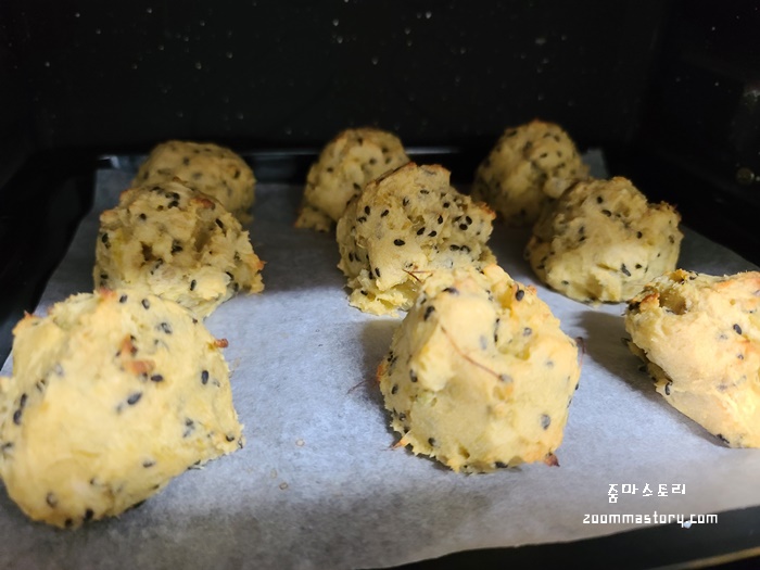 예열된 오븐에 넣고 180도 온도에서 10분 정도돌려 줍니다. 그리고 10분 후에 반죽을 한 번 더 뒤집어서 5분 정도 더 돌려 주면 전체적으로 맛있게 구워집니다. 겉바속촉으로 말이죠.
