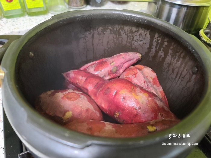 전 보통 압력밥솥에 고구마를 찝니다. 물은 붓지 않고 고구마를 씻은 뒤 바로 넣어서 약불에 쪄 주는데요. 호박고구마라 수분이 많아 타지 않고 맛있게 익어요.