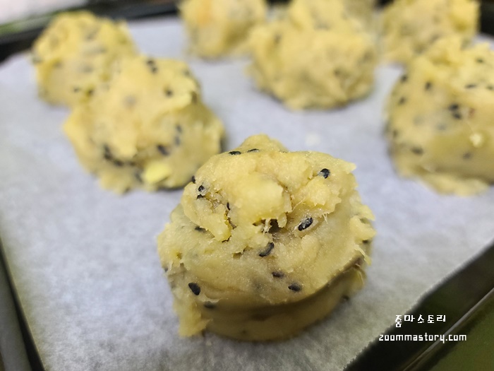 마지막으로 검은깨 약간 넣은 뒤 반죽을 해 줍니다. 전 호박고구마로 만들어서 괜찮은데 혹시 퍽퍽한 고구마라면 우유로 반죽의 농도를 맞추어도 됩니다.