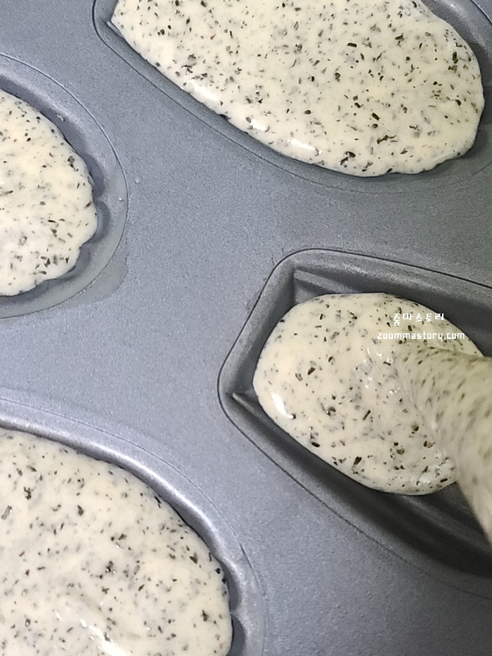5. 틀에 버터를 바른 뒤 쌀가루를 약간 뿌려주고 반죽을 틀의 80%만 채워 줍니다.