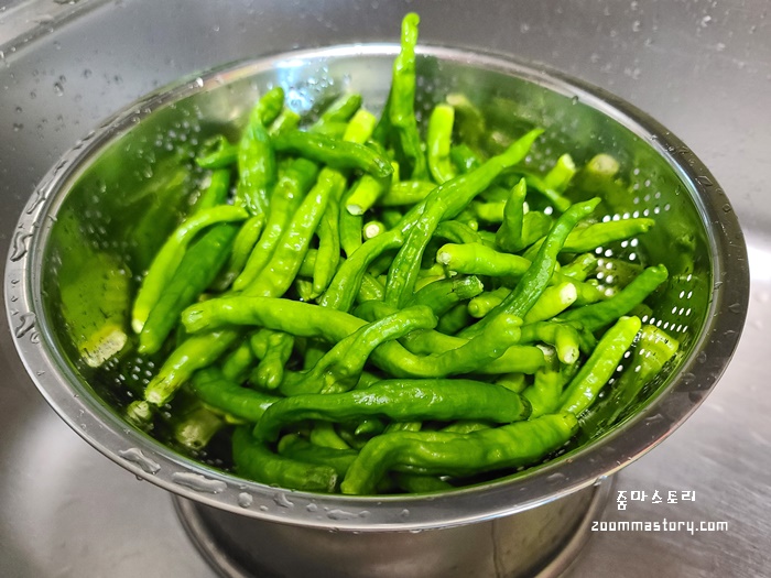 먼저 준비할 것은 꽈리고추인데요. 꽈리고추는 하루 정도 드실 양만 만들어 드시는게 제일 좋긴 해요. 전 여유있게 준비했어요. 꽈리고추가 저렴하길래~ ㅎㅎ