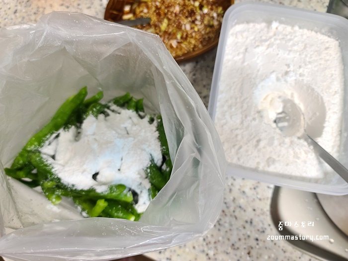 물기를 제거한 꽈리고추는 비닐봉지에 넣고 밀가루 약 4 숟가락을 섞어 줍니다.