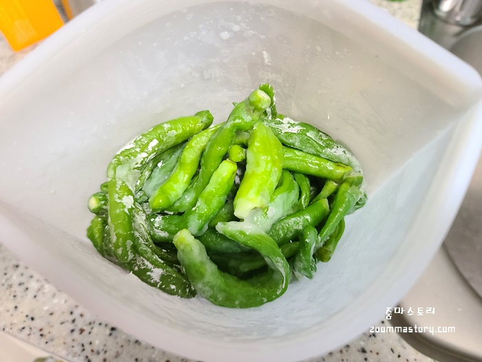 보통은 이렇게 밀가루를 묻힌 꽈리고추는 찜기에 쪄서 요리하는데요. 전 간단히 실리콘 지퍼백에 넣어 전자렌지에 돌려서 쪄 냈습니다. 시간은 2분 정도.... 각 가정마다 전자렌지 사양이 다르기에 잘 익지 않았다면 조금 더 돌리면 되겠죠.