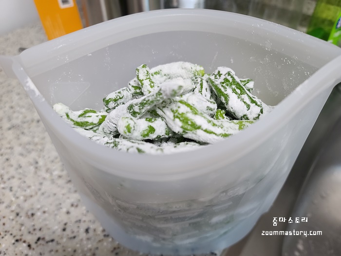 보통은 이렇게 밀가루를 묻힌 꽈리고추는 찜기에 쪄서 요리하는데요. 전 간단히 실리콘 지퍼백에 넣어 전자렌지에 돌려서 쪄 냈습니다. 시간은 2분 정도.... 각 가정마다 전자렌지 사양이 다르기에 잘 익지 않았다면 조금 더 돌리면 되겠죠.