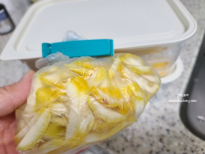 슬라이드 썬 레몬은 펼쳐서 하나씩 넣은 뒤 1회용 비닐봉지를 깔고 그 위에 올리는 방식으로 락앤락 통안에 넣어 냉동실에 보관하면 오랫동안 두고 드실 수 있습니다.