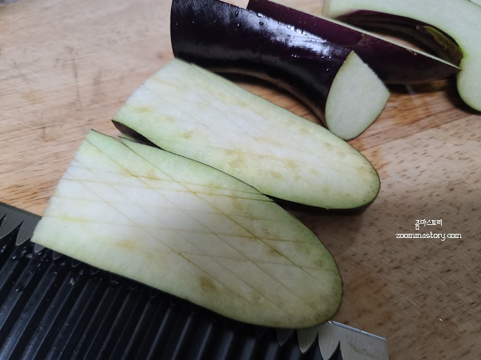 가지 조림을 하기 전 가지를 반으로 잘라 칼집을 넣어 주면 양념이 쏙쏙 잘 배어 들어 맛있어요.