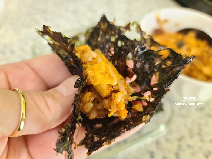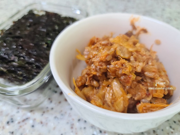 이렇게 만든 일명 참치가 들어간 김치 볶음밥은 조금 식혀 둡니다. 그래야 모양 내기가 쉽거든요. 식힐 동안 따뜻할때 한 그릇 김에 싸서 먹어 보았더니 정말 맛있었어요.
