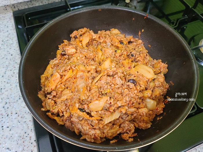 3. 2에 참치를 넣고 볶다가 밥을 넣고 볶으면 되세요. 생각보다 간단해 요리 초보자도 쉽게 접근할 수 있겠죠~