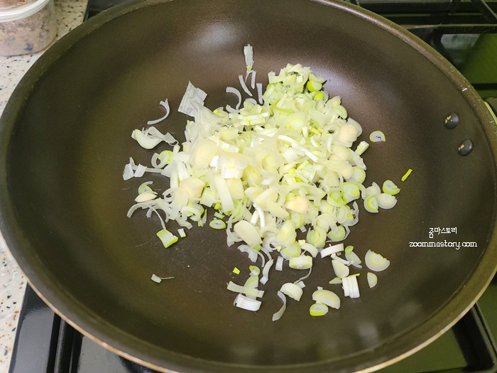 1. 기름에 대파를 먼저 볶아 파기름을 냅니다.