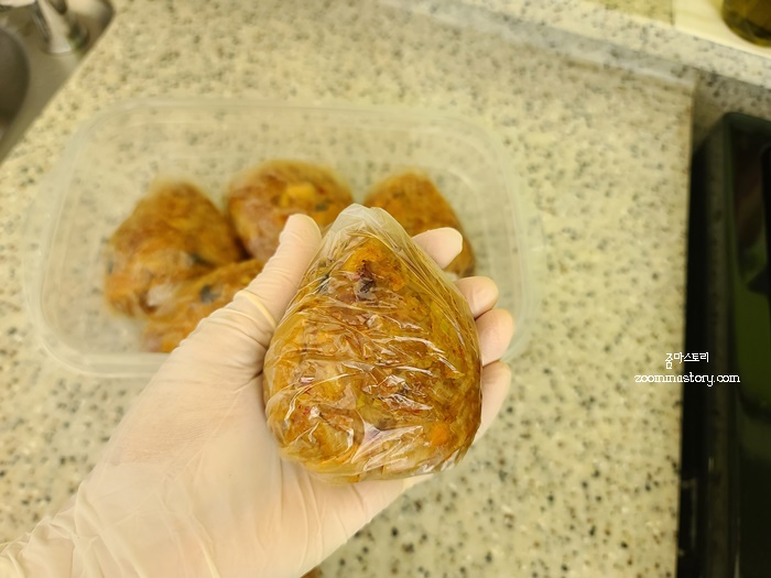 밥을 먹는 동안 후라이팬에 해 놓은 볶음밥이 거의 다 식었어요. 이제 손으로 조물조물 모양을 내어 줍니다. 삼각 모양이어도 좋고 동글한 모양이어도 괜찮아요. 편하신대로 하시면 되는데요. 삼각모양이 나중에 전자렌지로 데웠을때 속까지 골고루 데워지니 그것만 참고 하시면 됩니다.먼저 적정 크기로 동그랗게 빚어 주시고요.