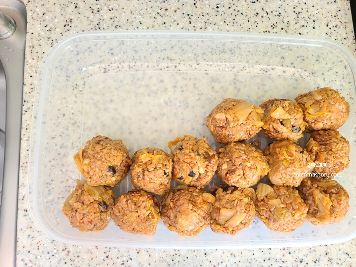 밥을 먹는 동안 후라이팬에 해 놓은 볶음밥이 거의 다 식었어요. 이제 손으로 조물조물 모양을 내어 줍니다. 삼각 모양이어도 좋고 동글한 모양이어도 괜찮아요. 편하신대로 하시면 되는데요. 삼각모양이 나중에 전자렌지로 데웠을때 속까지 골고루 데워지니 그것만 참고 하시면 됩니다.먼저 적정 크기로 동그랗게 빚어 주시고요.