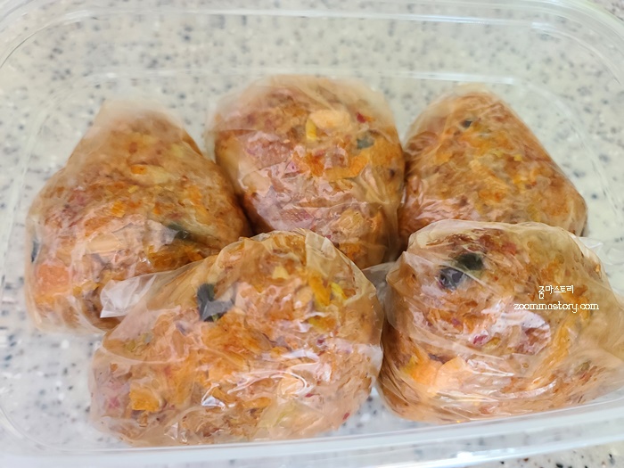 속에 치즈를 넣어서 삼각 모양으로 만들면 됩니다. 자세한 것은 동영상 글 마지막에 첨부 했으니 참고 하세요. 사실 이 상태로도 맛있긴 하지만 영양면에서 보충하기 위해 치즈를 넣었답니다. 치즈 안 좋아 하시면 이 과정을 패스 해도괜찮아요. 삼각 모양으로 만든 건 랩이나 1회용 비닐봉지에 감싸 락앤락 통에 담아 냉동실에 보관하면 일주일은 족히 편하게 아침 식사를 하실 수 있을겁니다.