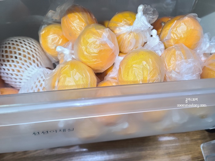 저도 한 박스 선물 받자마자 이렇게 1회용 비닐팩에 개별 포장해서 냉장고 야채 신선칸에 넣었어요.