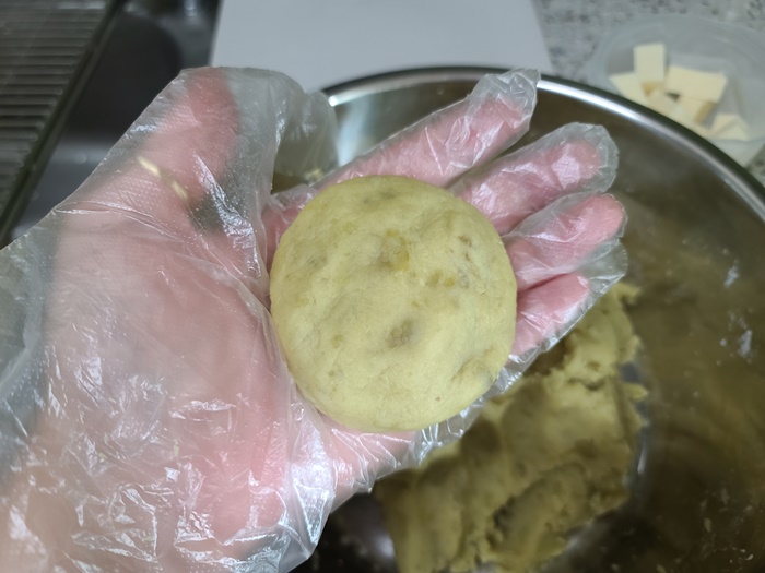 이렇게 반죽을 한 뒤에는 치즈를 넣을거라 적당한 크기로 잘라 줍니다. 전 얼마 전 대용량 치즈 소분해 둔 게 있어서 그걸 사용했어요.