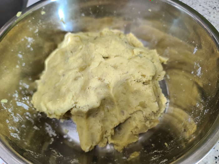 고구마의 양이 많아 전분을 조금씩 넣으면서 반죽했어요. 혹시 집에서 따라 하고 싶으신 분들은 저처럼 전분을 조금씩 넣으면서 반죽하면 실패 없이 모양을 이쁘게 잡을 수 있어요.