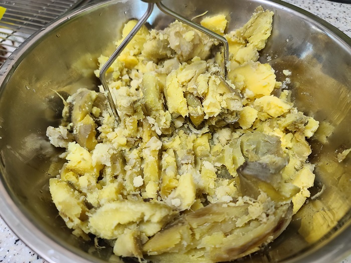 먼저 삶아 놓은 고구마는 껍질을 다 벗겨서 으깨어 줍니다. 그 다음은 전분가루를 넣고 섞어서 반죽을 해주면 되는데요. 생각보다 잘 뭉쳐져서 동글동글 빚기 좋아요.