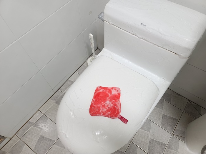 세면대, 욕실거울, 욕실 벽등 청소 후에는 마지막에 양변기 주변도 닦아 주어요. 세제 약간만 묻혀서 거품이 풍성해서 두 번 세 번 세제를 묻힐 필요가 없어 알뜰하기까지 합니다.
