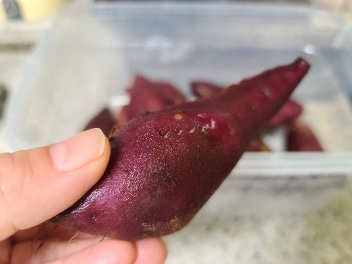 삶아 놓은 고구마를 꺼내 먹기 좋은 크기로 자르기로 했어요. 일명, 빼때기처럼 먹으려고요.