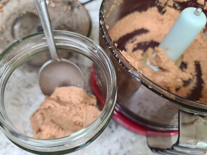 분쇄기로 30초 정도 돌리면 아래 사진처럼 엄청 곱게 갈아진 모습인데요. 이 상태에서 올리브오일을 넣어 10초~ 20초 정도 돌려주면 시중에 파는 땅콩버터의 모습이 됩니다.