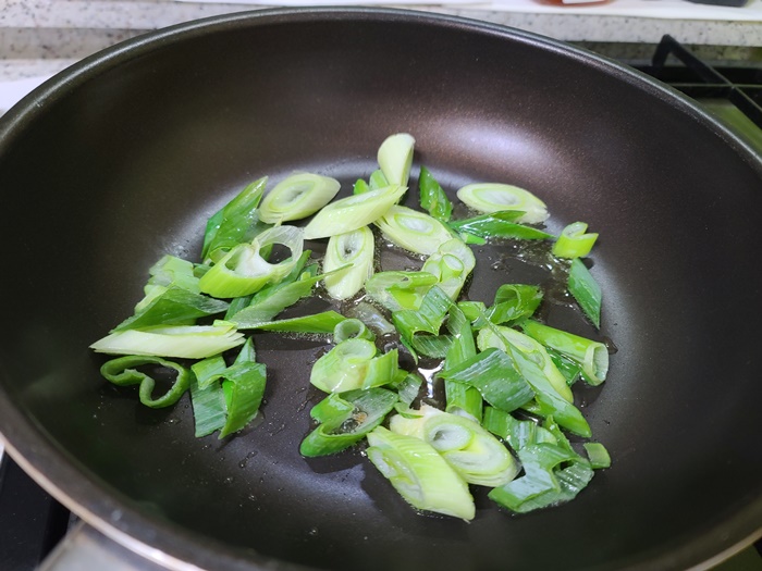 팬에 올리브오일을 두르고 대파를 볶아 줍니다.