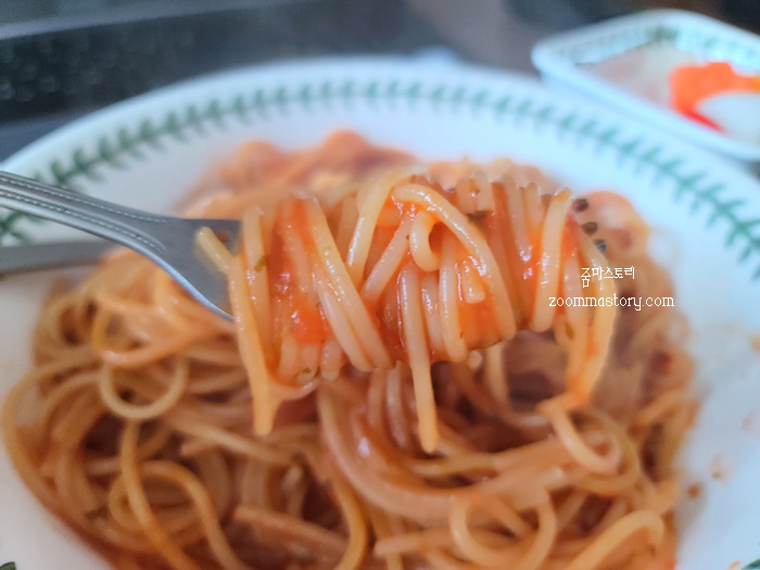 면수를 조금 남기고 소스를 넣어 한 번 더 섞어 주면 맛있는 토마토 스파게티 완성입니다. 채소도 같이 넣어 먹으면 더 맛있겠지만 이거 원 넣을 채소가 다 바닥나서 스파게티 먹고 마트에 장 보러 가야겠네요.