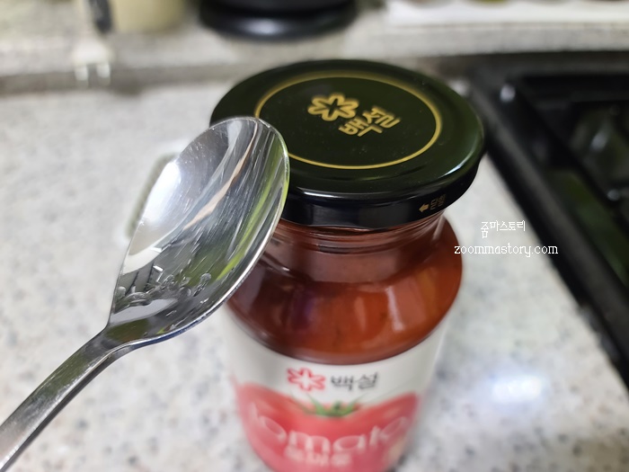 면이 다 삶겨 가는데 새로 산 스파게티 소스 뚜껑이 안 열리지 뭡니까? 면이 더 퍼지기 전에 숟가락으로 해결해 봅니다.