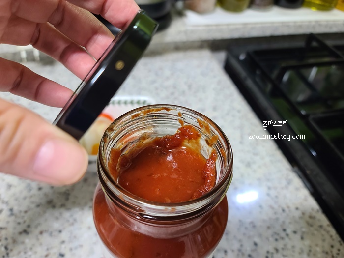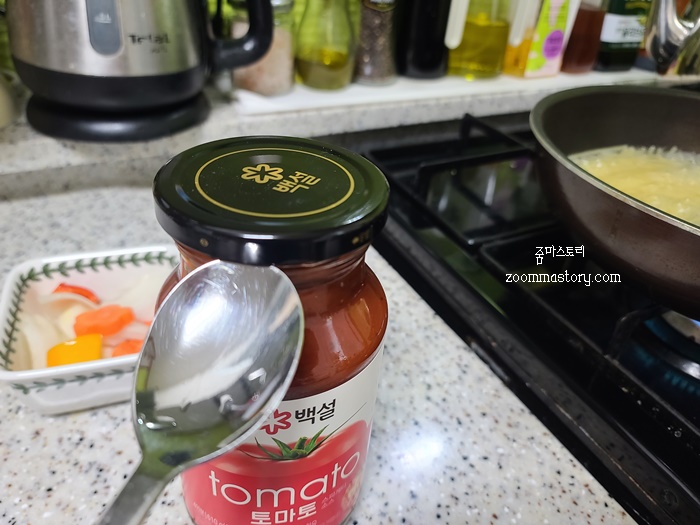 면이 다 삶겨 가는데 새로 산 스파게티 소스 뚜껑이 안 열리지 뭡니까? 면이 더 퍼지기 전에 숟가락으로 해결해 봅니다.