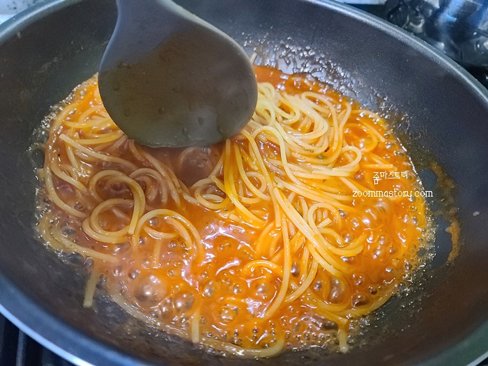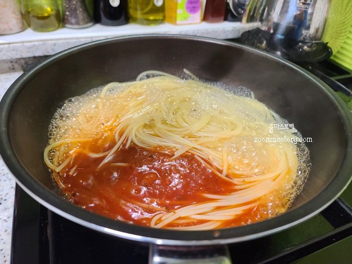 면수를 조금 남기고 소스를 넣어 한 번 더 섞어 주면 맛있는 토마토 스파게티 완성입니다. 채소도 같이 넣어 먹으면 더 맛있겠지만 이거 원 넣을 채소가 다 바닥나서 스파게티 먹고 마트에 장 보러 가야겠네요.