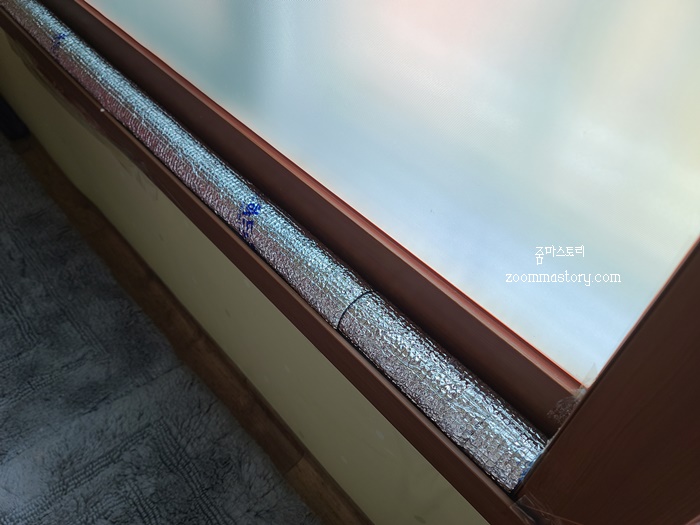 전 우풍을 막기 위해 수도 동파 방지용으로 사용하는 커버를 활용했어요. 아파트라 수도 동파 격정은 없어서 여기 창문 틈사이에 끼웠답니다. 그랬더니 바람이 현저히 줄어들었어요. 그리고 창틀 사이를 이렇게 끼워 메꾸어도 창틀 옆 부분을 안 막으면 거기서도 바람이 숭숭 들어와요. 전 거기도 막았답니다. 이 두 군데만 막아도 외풍이 현저히 줄어듭니다.