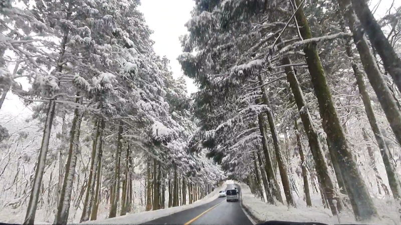 사려니숲길 들어 가는 길은 마치 겨울왕국에 나오는 풍경처럼 신비로웠다. 이곳이 이정도 설경인데 1100고지로 가는 도로는 가히 절경일터인데 오늘도 그곳은 통제였다. 그래도 이 정도만 봐도 제주도 겨울 낭만은 온몸으로 느끼기에 충분했다.