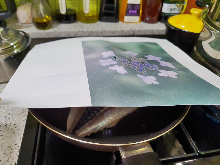 집에 신문지나 지나간 달력이 있다면 생선 구울때 저처럼 구멍을 중앙에 뚫어 사용해 보세요. 생선구이 냄새도 환풍기를 통해 한 방에 나갈 수 있고요. 무엇보다도 생선 굽는 주변이 평소와 달리 엄청 깨끗하다는 것을 느끼실거예요.