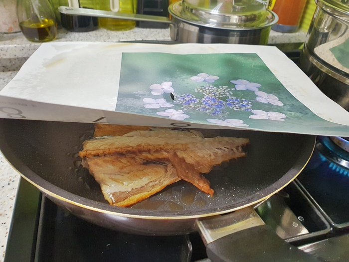 저만의 생선 굽는 노하우는 바로 종이를 덮은 뒤 중앙에 구멍을 뚫어 주는 겁니다. 그렇게 하면 생선을 구울때 기름이 온 사방에 튀는 것도 방지할 뿐더러 생선도 눅눅하지 않고 겉바속촉으로 잘 익어요.