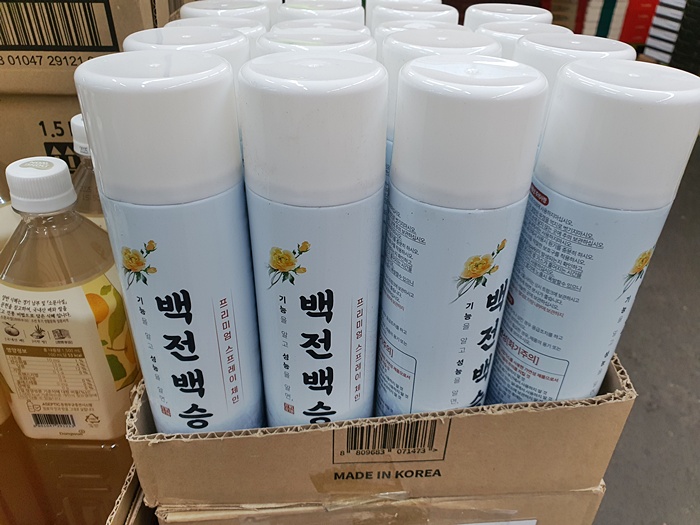 이건 또 뭐지? 조금 생뚱맞는 스프레이인데 자세히 보니 스프레이 체인이네요. 이름도 백전백승 생뚱 맞긴 한데 스프레이 모습도 이게 스프레이 체인이 맞나 싶을 정도로 자세히 보지 않으면 그냥 에프킬라 같아 보였어요. 하여간 간만에 들린 식자재 마트에서 재미난 제품들이 입구에서 그저 미소짓게 만든 하루였네요.