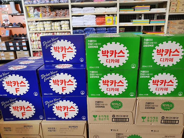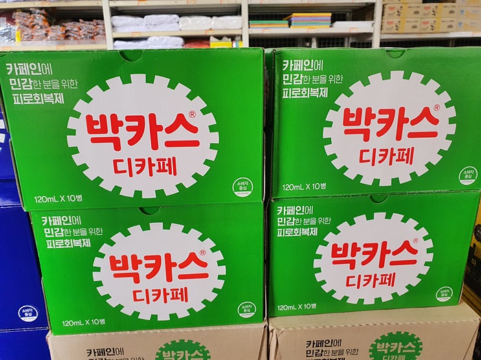왼쪽 파란색의 박카스 박스는 많이 봐 왔지만 오른쪽 연두색 박카스 박스는 처음 봤네요. 자세히 보니 박카스도 디카페로 나오네요. 카페인에 민감한 분을 위한 피로 회복제라고 쓰여 있습니다.