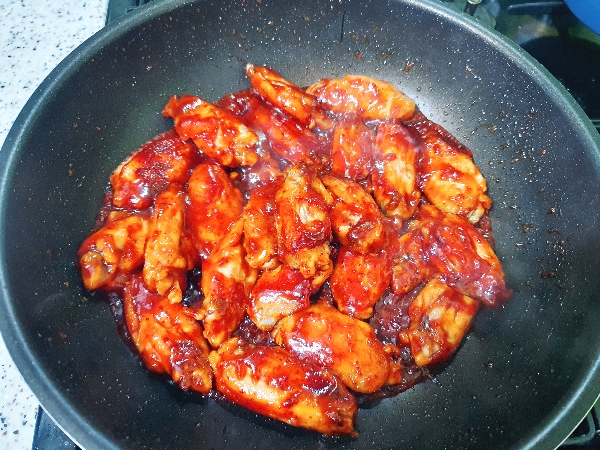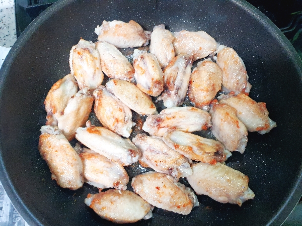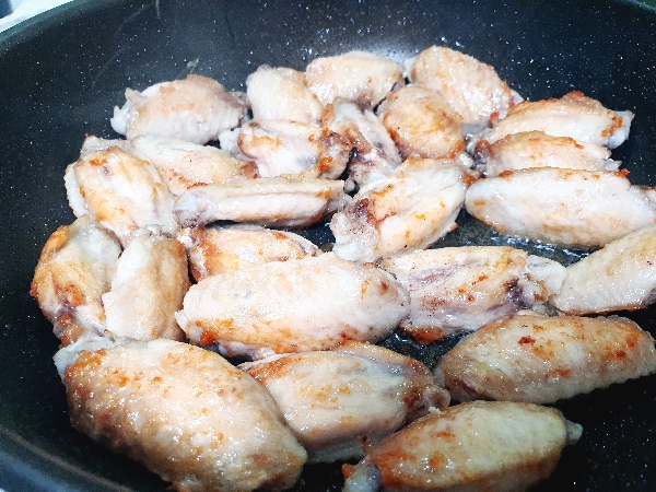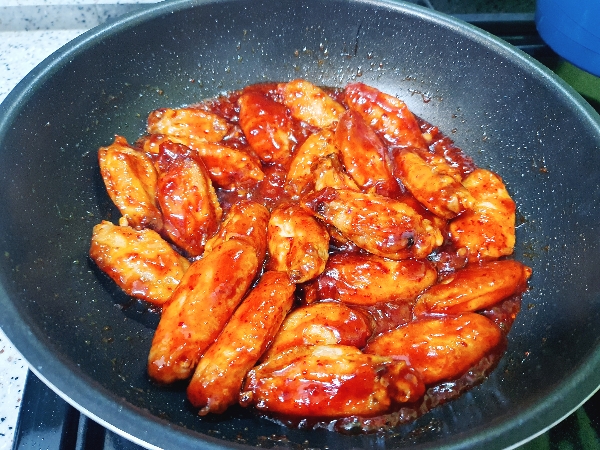 잘 구워진 닭날개에 양념을 넣고 약불에서 타지 않게 구워 줍니다.
