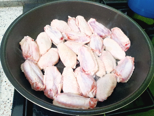 물기 제거 후엔 올리브오일 약간 두른 후라이팬을 달군 뒤 닭날개를 하나씩 뒤집어 가며 구웠어요. 날개가 작아서 따로 염지는 안했어요.