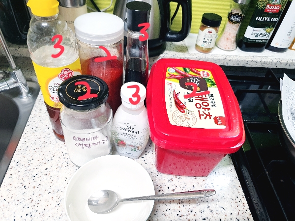 지코바 양념은 생각보다 간단해요. 간장 3스푼 고추장 2스푼 고추가루 2스푼 물엿 3스푼 케첩 3스푼 스테비아 2스푼 마늘 약간 들어 갑니다.