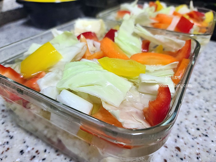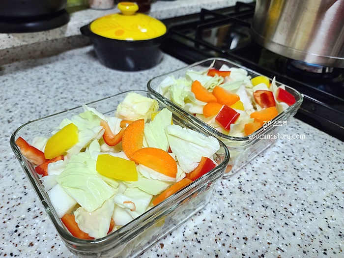 피클로 담글 채소는 양배추, 피망 그리고 당근을 준비했답니다. 양파도 같이 넣어도 괜찮아요.