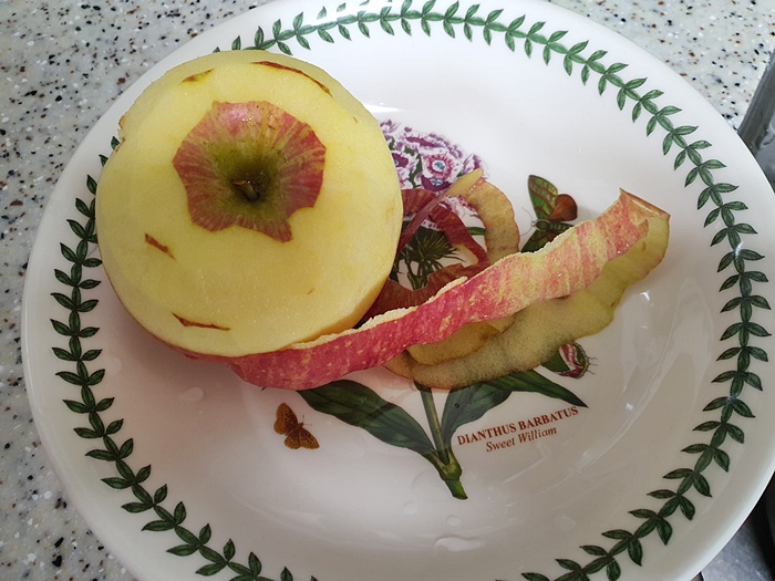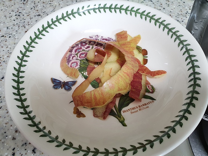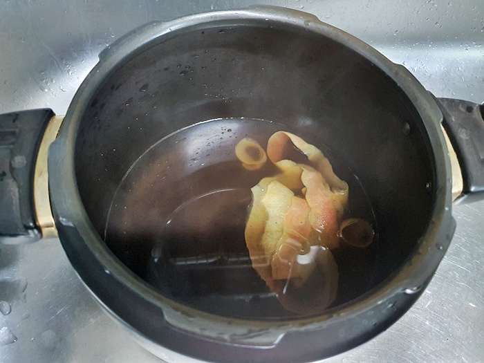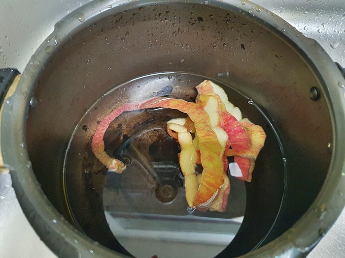 평소엔 사과를 깨끗이 씻어 그냥 껍질째 먹지만 오늘은 압력밥솥을 닦기 위해 껍질을 깎았답니다. 사과껍질 속 구연산이 탄 자국을 분해하면서 닦는데 많은 도움을 줍니다.