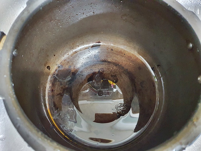 끓였더니 물이 제법 더러워졌어요. 이 상태로 물을 버린 후에 수세미로 바로 닦으시면 되는데요. 뜨거울때 닦아야 효과가 있으니 참고하세요.
