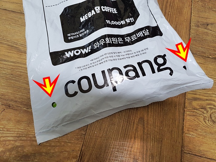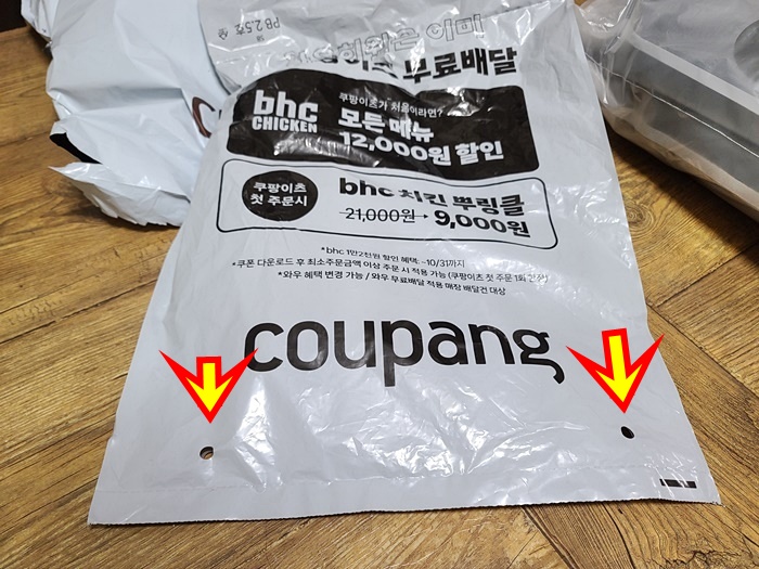 하지만 이제 가위, 칼 그런거 필요 없어요. 쿠팡 비닐봉지를 보면 저렇게 양쪽 끝에 구멍이 나 있잖아요. 그곳을 공략하면 됩니다.