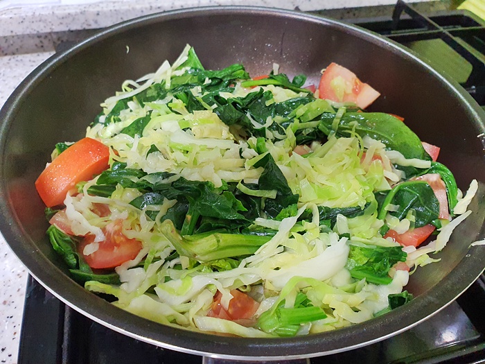 요즘 아침으로 많이들 해 드시는 채소로 만든 한 끼 간단하게 만들었어요. 예열된 후라이팬에 올리브오일을 넣고 먼저 양배추를 넣고 볶아 줍니다. 그 다음엔 시금치, 토마토 순으로 볶아요. 간을 할때는 소금으로 간단히 하면 되는데 전 간을 따로 하지 않고 굴소스 약간 넣었습니다.