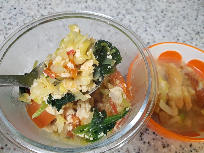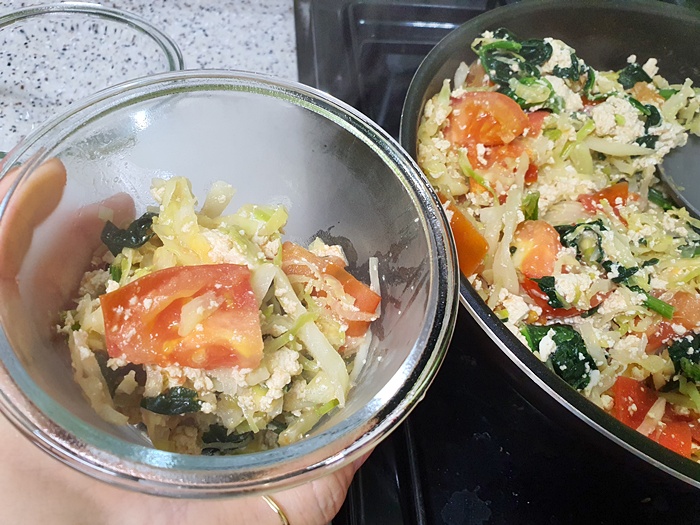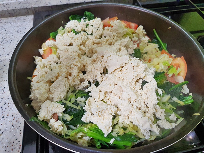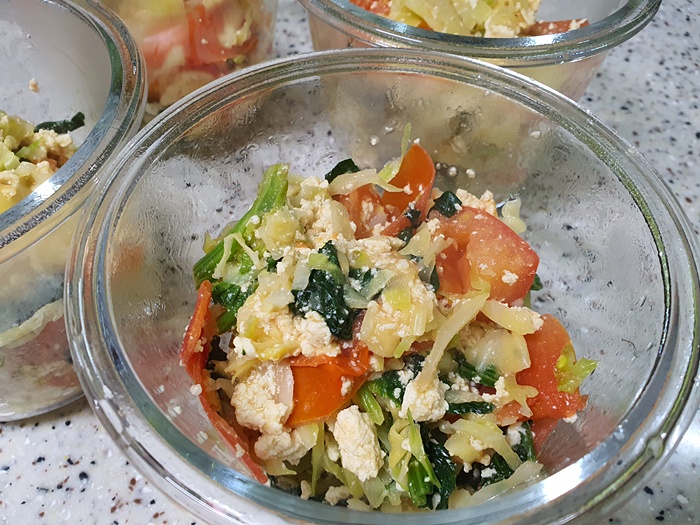 아참... 두부도 남아 있는게 있길래 전자렌지에 한 번 돌려 물기를 쫙 빼고 으깨어 넣었어요. 식물성 단백질이 우수한 식품이라 채소와 너무도 잘 어울리거든요. 물론 냉장고 속 재료 정리도 할겸 ....