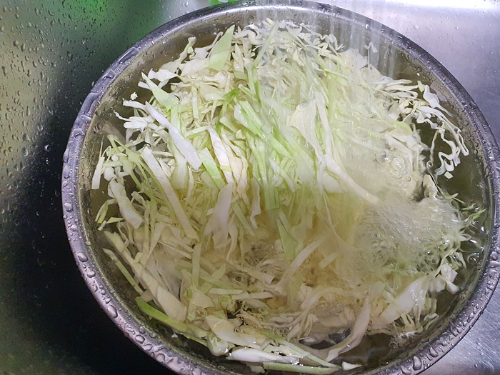 양배추 씻을때는 따로 뭔가 넣지는 않아요. 채를 썰어서 물에 잠깐 담궈 놓은 뒤 한 두 번 헹궈내면 됩니다.