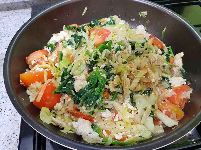 요즘 아침으로 많이들 해 드시는 채소로 만든 한 끼 간단하게 만들었어요. 예열된 후라이팬에 올리브오일을 넣고 먼저 양배추를 넣고 볶아 줍니다. 그 다음엔 시금치, 토마토 순으로 볶아요. 간을 할때는 소금으로 간단히 하면 되는데 전 간을 따로 하지 않고 굴소스 약간 넣었습니다.
